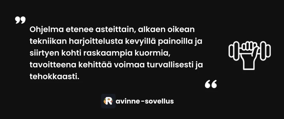 ❌ Virhe 4: Liian nopea progression Painojen lisääminen liian nopeasti johtaa tekniikan romahtamiseen ja loukkaantumisiin. Ratkaisu: noudata ohjelman prosentteja ja lisää painoa vasta kun tekniikka on täysin hallinnassa.