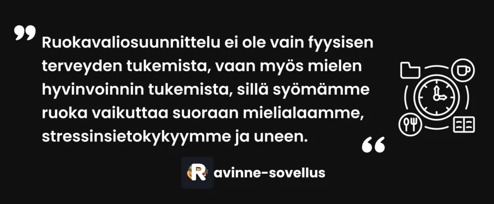 Laaja ranskalainen tutkimus yli 40 000 aikuisesta osoitti, että ateriasuunnittelu on yhteydessä parempaan ruokavalion laatuun, monipuolisempaan ruokavalioon ja terveellisempään painoon [4]. Suunnittelu vähentää pikaruoan houkutusta ja lisää kotona valmistettujen aterioiden määrää.