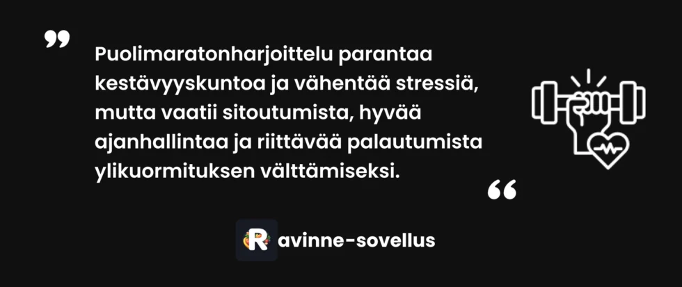 Puolimaraton on kestävyyslaji, joka vaatii tehokasta aerobista energiantuottoa ja kykyä sietää maitohappoa. Tyypillisesti puolimaraton juostaan 80-90% maksimaalisesta hapenottokyvystä, mikä tekee siitä erittäin vaativan matkan.