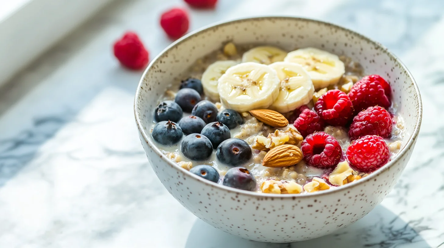 Aamiainen (380 kcal, 28 g proteiinia): Kaurapuuro 40 g kaurasta, 200 ml rasvattomasta maidosta, 1 banaani, 15 g manteleita ja 150 g raejuustoa.