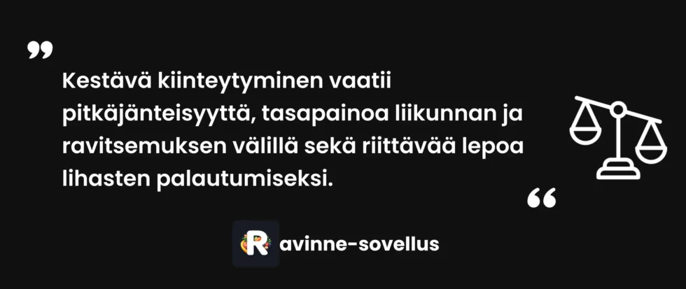 | Johdonmukaisuus | Mahdollistaa pitkäaikaisen muutoksen | Min. 8-12 viikkoa tuloksiin |