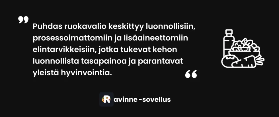 Puhdas ruokavalio perustuu kokonaisiin, vähän prosessoituihin ruokiin. Opi periaatteet, hyödyt, ruokalistat ja vinkit terveelliseen arkisyömiseen tutkittuun tietoon perustuen.