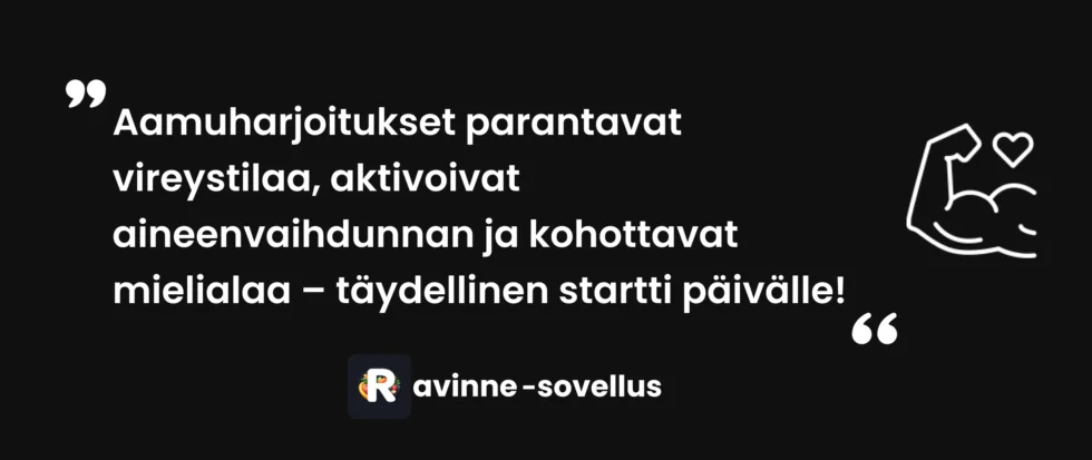 Tehokas aamuharjoitus on yksi parhaista tavoista aloittaa päivä. Tutkimukset osoittavat, että aamuliikunta tehostaa rasvanpolttoa (erityisesti tyhjällä vatsalla), parantaa unenlaatua ja nostaa energiatason koko päiväksi. Jo 15 minuutin HIIT-harjoitus riittää merkittäviin hyötyihin.