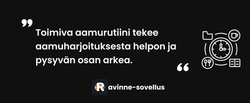 Aloita pienesti, valmistaudu illalla ja anna itsellesi aikaa sopeutua. Kun aamuharjoittelusta tulee tapa, se muuttuu päivän kohokohdaksi eikä pakkopullaksi.