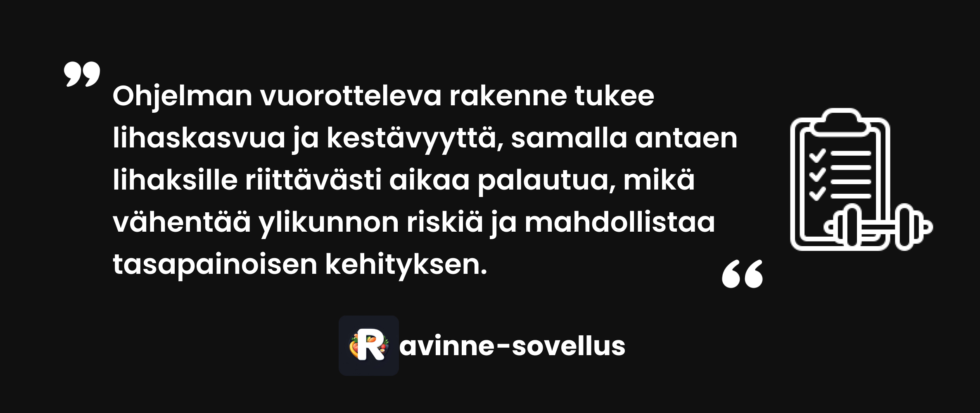 Neljä treeniä viikossa jättää kolme lepopäivää. Tutkimuksessa osa osallistujista keskeytti ohjelman ajanpuutteen vuoksi – ja suurin osa heistä oli 4x viikossa harjoittelevassa ryhmässä [2]. Tämä muistuttaa, että ohjelman pitää sopia elämään. 2-jako mahdollistaa esimerkiksi maanantai-tiistai ja torstai-perjantai aikataulun, jolloin viikonloppu jää vapaaksi.