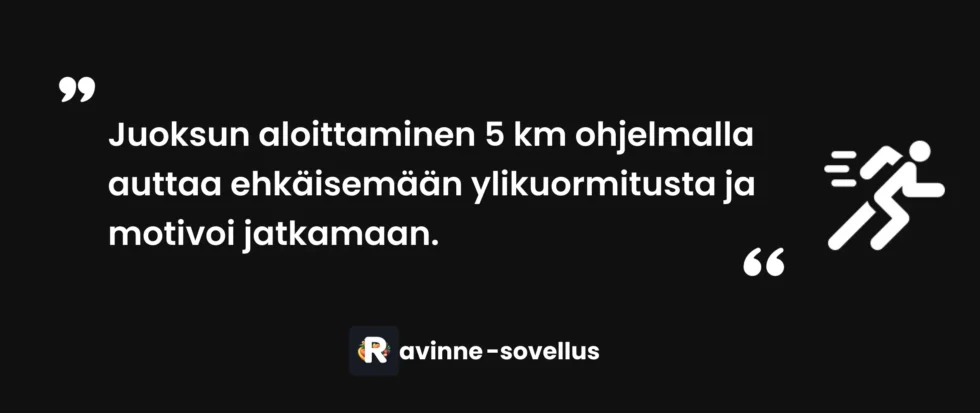 5 kilometri on ihanteellinen ensimmäinen tavoite, koska se on saavutettavissa 8 viikossa ilman aiempaa juoksutaustaa, mutta silti tarpeeksi haastava motivoimaan. Matka on lyhyt tarpeeksi, ettei se vaadi massiivista aikainvestointia, mutta pitkä tarpeeksi tuottamaan merkittäviä terveyshyötyjä. Tutkimus osoittaa, että jo viikoittainen alle 50 minuutin juoksumäärä riittää vähentämään kuolleisuusriskiä merkittävästi [2].