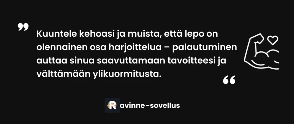 ❌ Virhe 2: Lepopäivien ohittaminen Kehosi vahvistuu lepopäivinä, ei harjoituspäivinä. Ilman riittävää palautumista ylikuormitat kehoasi. Ratkaisu: pidä aina vähintään yksi lepopäivä harjoitusten välissä.
