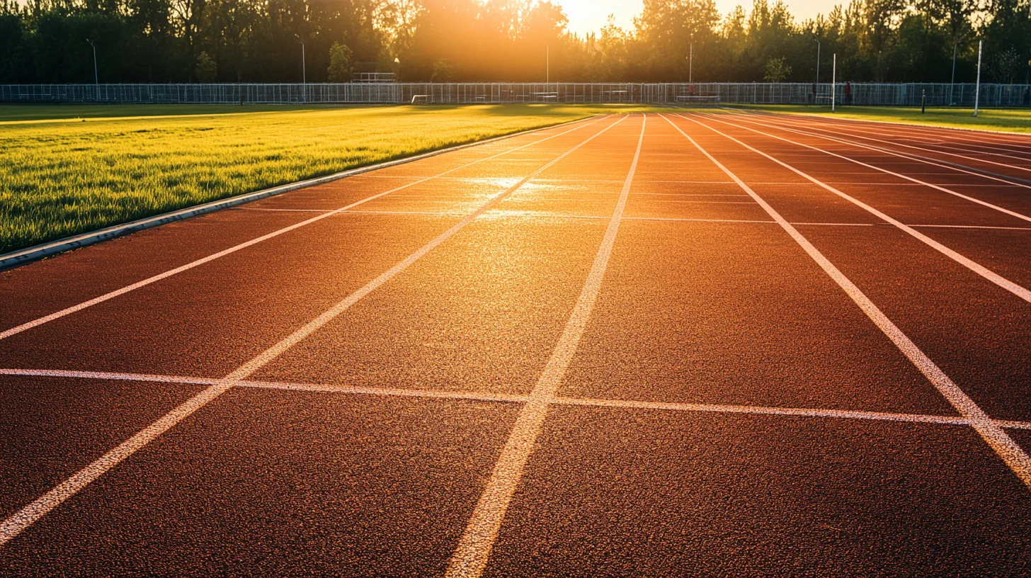 Empty running track at sunrise, lane markings visible, soft golden hour lighting, morning dew on surface, athletic stadium atmosphere, no people in frame, wide angle sports photography --ar 16:9 --v 6.1 --style raw --s 50