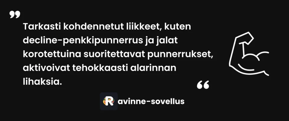 ❌ Virhe 3: Alarinnan harjoittelun laiminlyönti Monet keskittyvät vain tasapenkkiin ja vinopenkkiin, jolloin alarinta jää kehittymättä. Sisällytä vähintään kaksi kohdistettua alarintaliikettä viikottaiseen ohjelmaasi.