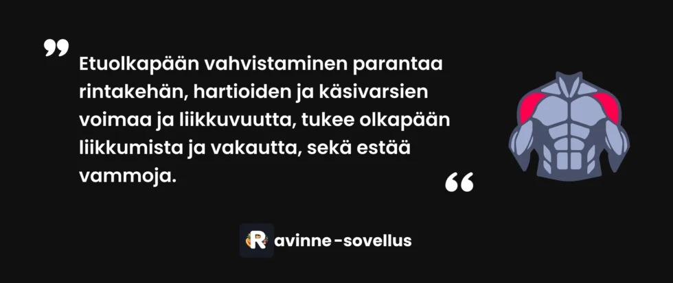 Etuolkapäiden liiallinen harjoittelu voi johtaa epätasapainoon etu- ja takaolkapäiden välillä. Varmista, että harjoittelet myös keski- ja takaolkapäitä tasapainoisesti. Tutustu vetäviin liikkeisiin takaolkapäiden kehittämiseen.