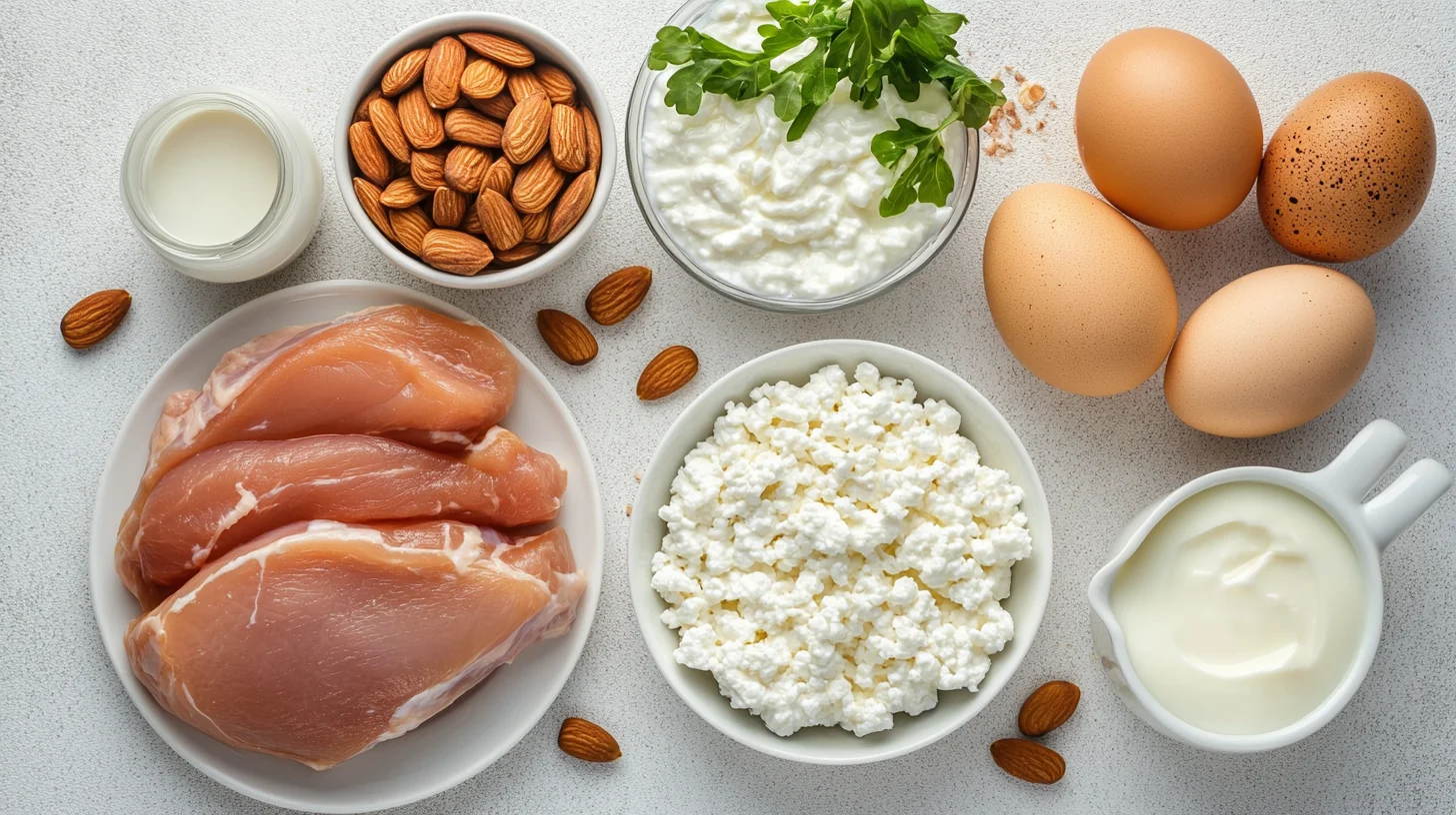 High protein foods arrangement: greek yogurt, cottage cheese, chicken breast, eggs, almonds on modern kitchen counter, overhead angle, bright natural lighting, clean food photography aesthetic, no people visible --ar 16:9 --v 6.1 --style raw --s 50