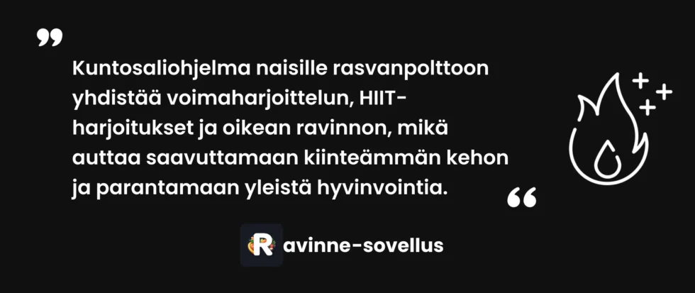 Tehokas rasvanpoltto-ohjelma naisille perustuu voimaharjoittelun, HIIT:n ja maltillisen kalorivajeen yhdistelmään. Tutkimukset osoittavat, että voimaharjoittelu on kriittistä lihasmassan säilyttämiseksi ja perusaineenvaihdunnan ylläpitämiseksi laihdutuksen aikana [1], [2]. HIIT tehostaa kalorien kulutusta ajankäytöltään tehokkaasti [3]. Maltillinen kalorivaje (300-500 kcal) ja riittävä proteiini (1.6-2.2 g/kg) varmistavat kestävän tuloksen.